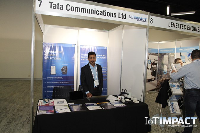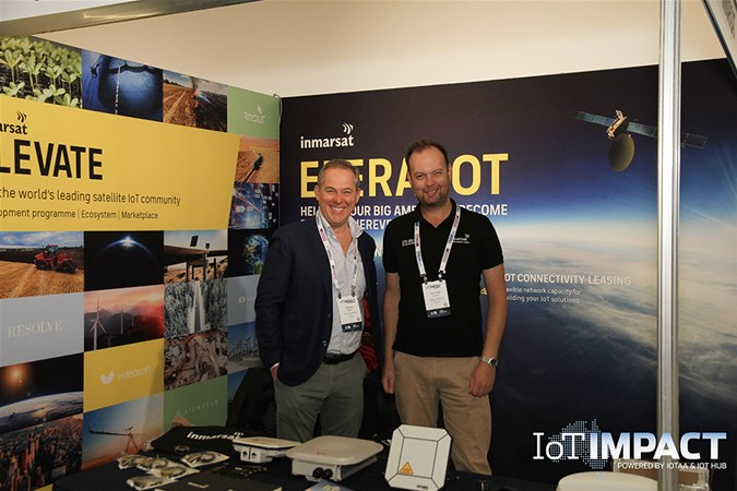 The Inmarsat stand. Inmarsat's Carl Statham spke on stage at IoT Impact about how Inmarsat services are being used to support initiatives aimed at reducing the impact of human activity on the environment, and how IoT technologies and services can support environmental initiatives.